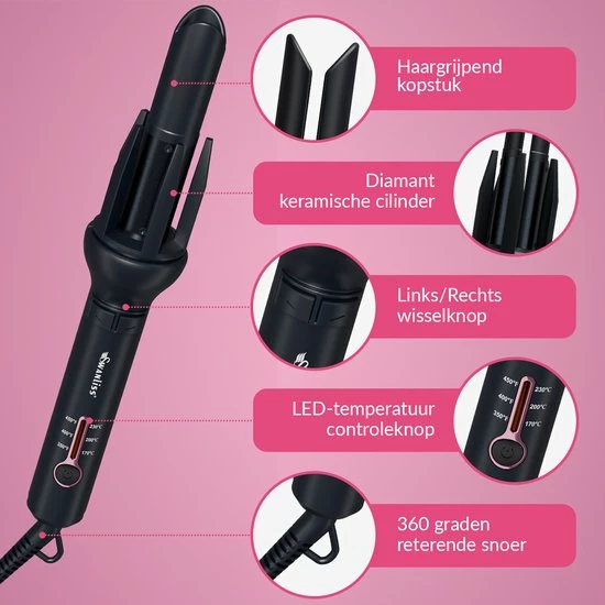 Met de automatische krultechnologie word je haar automatisch en voorzichtig links- of rechtsom rond de keramische cilinder van de kruller gedraaid waar het wordt vastgehouden, getimed en verwarmd om moeiteloos de perfecte krul te vormen. Ongeacht je haarlengte of type, deze haarkrultool cre?ert foutloze krullen gemakkelijker dan ooit! De cilinder kan 360 graden draaien, in beide richtingen en beschikt over een Nano-diamant keramische coating. Dit heb je nog nooit gezien!
