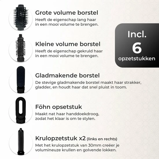 - 6 opzetstukken (2x krul, grote en kleine volumeborstel, fohn opzetstuk, gladmakende borstel)