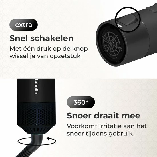 De Tutabelle heeft een 360 graden draaiende snoer ontwikkelt, waardoor je eenvoudig op dezelfde positie kun blijven staan zonder last te krijgen van de snoer. Dit geeft extra comfort tijdens het stijlen, waardoor je haar in model brengen nog leuker wordt.