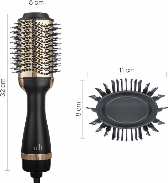 Wil je je haar föhnen, stijlen of krullen? Dit kan allemaal met onze föhn borstel! Geen gepruts meer met een borstel in de ene hand en een föhn in de andere, vanaf nu kan je met één product drogen, stijlen of krullen. En door de ovaalvorm van de kop is het extra eenvoudig om slag en volume te creëren. De kop is voorzien van flexibele nylon pinnen en borstelharen, deze zorgen voor klitvrij haar en zal het zijdezacht gaan aanvoelen. Bovendien zorgt de 2 meter lange en 360° meedraaiend snoer voor een volledige bewegingsvrijheid.