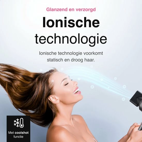 De ionische technologie in onze föhn zorgt ervoor dat jouw haren tijdens het drogen omhult worden door negatieve ionen. Dit betekend dat er als het ware een schild ontstaan voor je haar. Tijdens föhnen worden je haren beschermd tegen warme lucht en worden positief geladen watermolecule sneller afgevoerd. Het drogen zal hierdoor sneller gaan maar het zorgt er ook voor dat je haar niet uitdroogt, niet statisch wordt en zeker niet gaat pluizen!