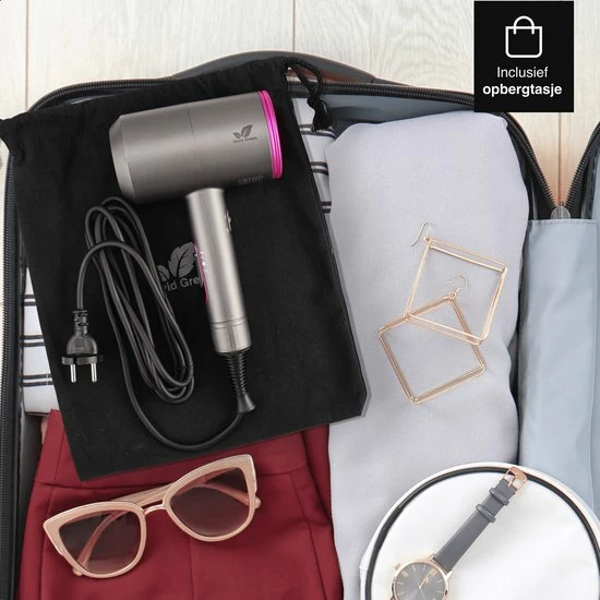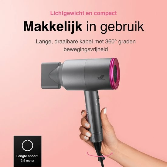 De haardroger heeft een lichtgewicht design, dit zorgt ervoor dat je niet zo snel lamme armen krijgt van al dat föhnen. De 2,5 meter lange kabel kan 360° draaien en zorgt ervoor dat je niet super dicht bij een stopcontact hoeft te zitten. Dankzij het compacte design en het opbergzakje kun je de haarföhn eenvoudig meenemen zonder deze te beschadigen.