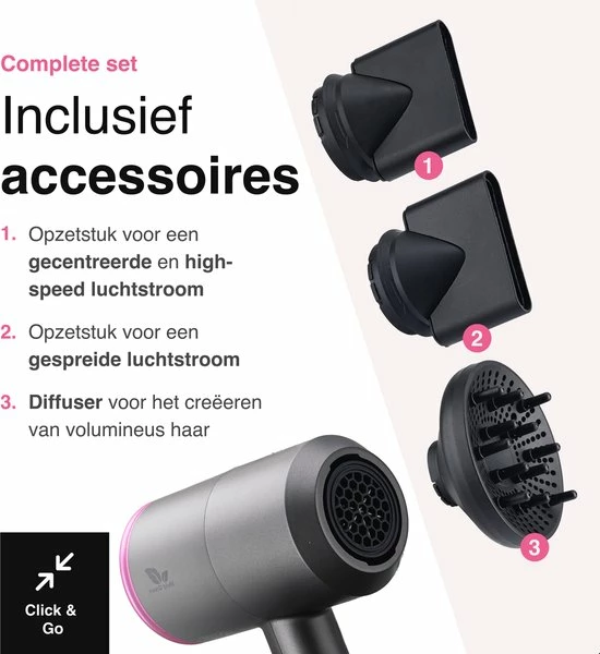 Inhoud: 1x Haarföhn, 3x Opzetstukken (waarvan 1x diffuser), 1x Opbergzakje, 1x Digitale handleiding