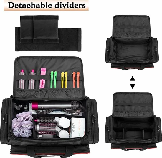 - Verstelbare vakken: Het hoofdvak heeft het voordeel van onze 3 verstelbare scheidingswanden waar de opslagruimte individueel kan worden vergroot of verkleind, zodat het voldoende ruimte biedt voor kappersgereedschap zoals haardrogers, stijltang enz. 6 elastische sleuven voor krulspelden, haarklemmen enz.