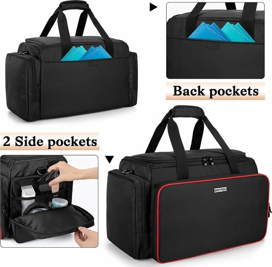 - Multifunctioneel opbergen: 2 netzakken en 1 achterzak voor tondeuse en kapperscape.