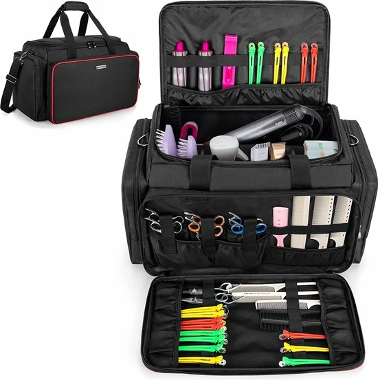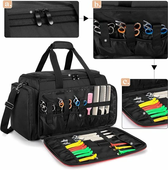 - Voorkant opbergruimte: Het voorste deel heeft 3 zakken en meerdere elastieken voor het bevestigen van haarschaar, kammen en andere salonaccessoires.